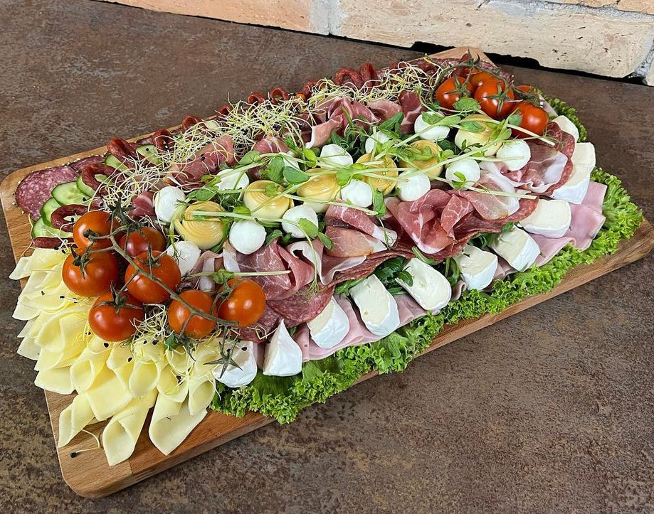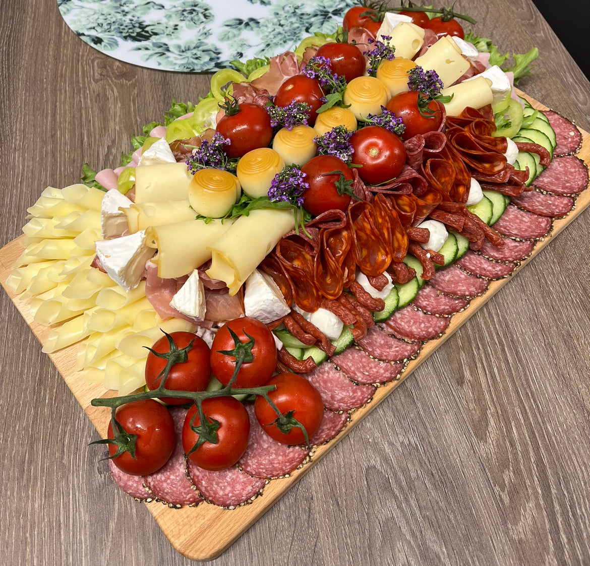 Obložená misa s vlašským šalátom, šunkami, salámami, syrmi rôznych druhov, dozdobené zeleninou.